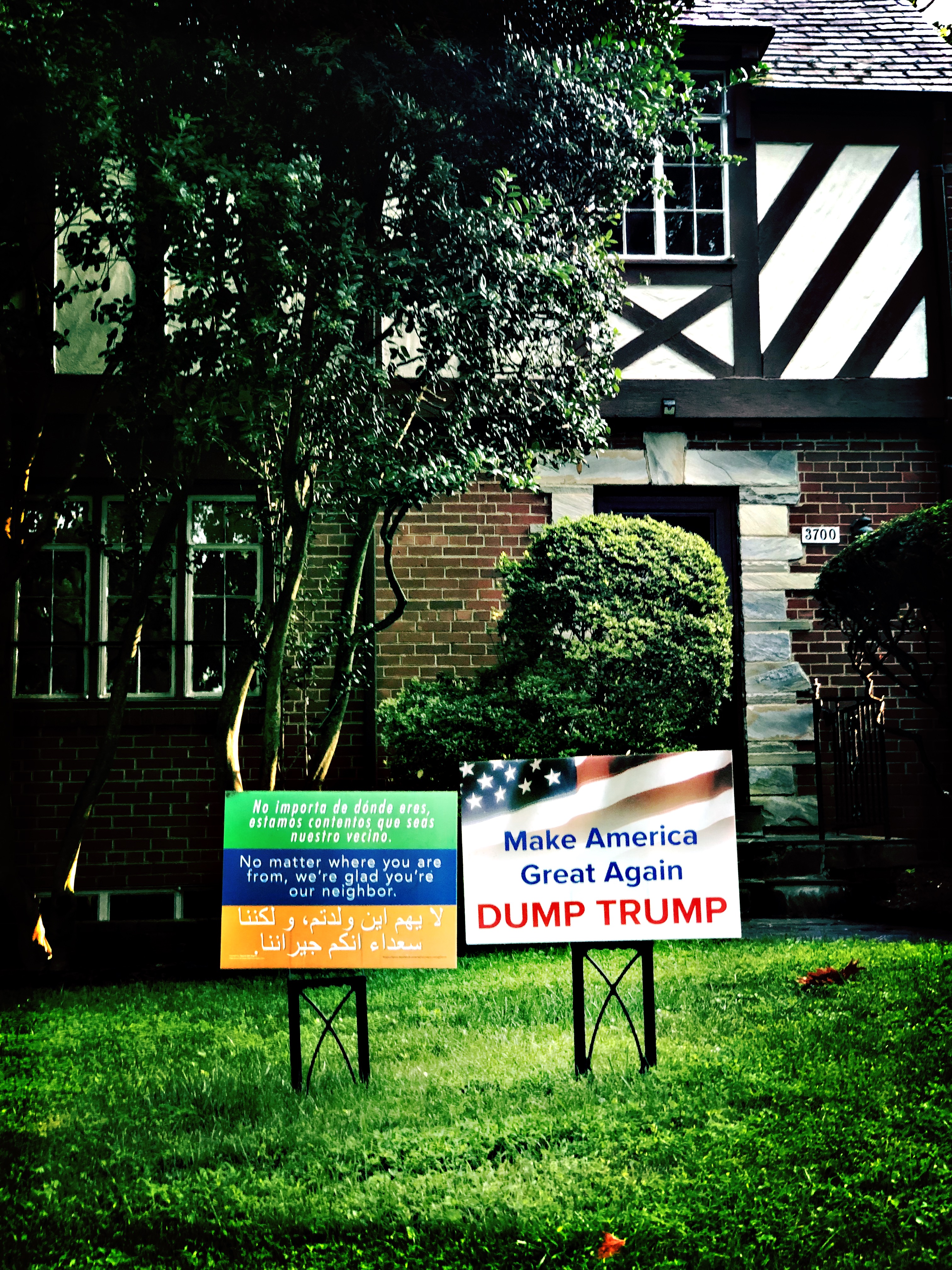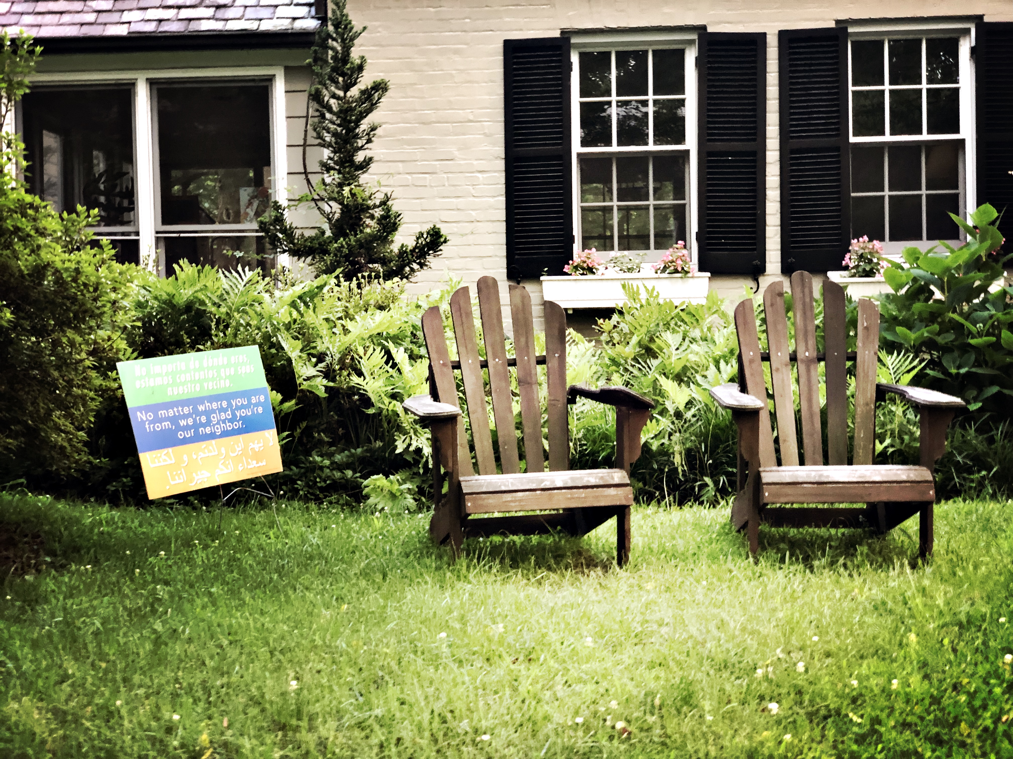 During our walks, the most common sign we have seen is the one in the following photo, stating that “no matter where you are from, we’re glad you’re our neighbor”. In these times, when the President is rallying anti-immigration forces, it’s always reassuring to see the signs. We, particularly, liked this sign, sitting, as it does, next to two Adirondack chairs, as if it is inviting the neighbors to sit and rest a while.