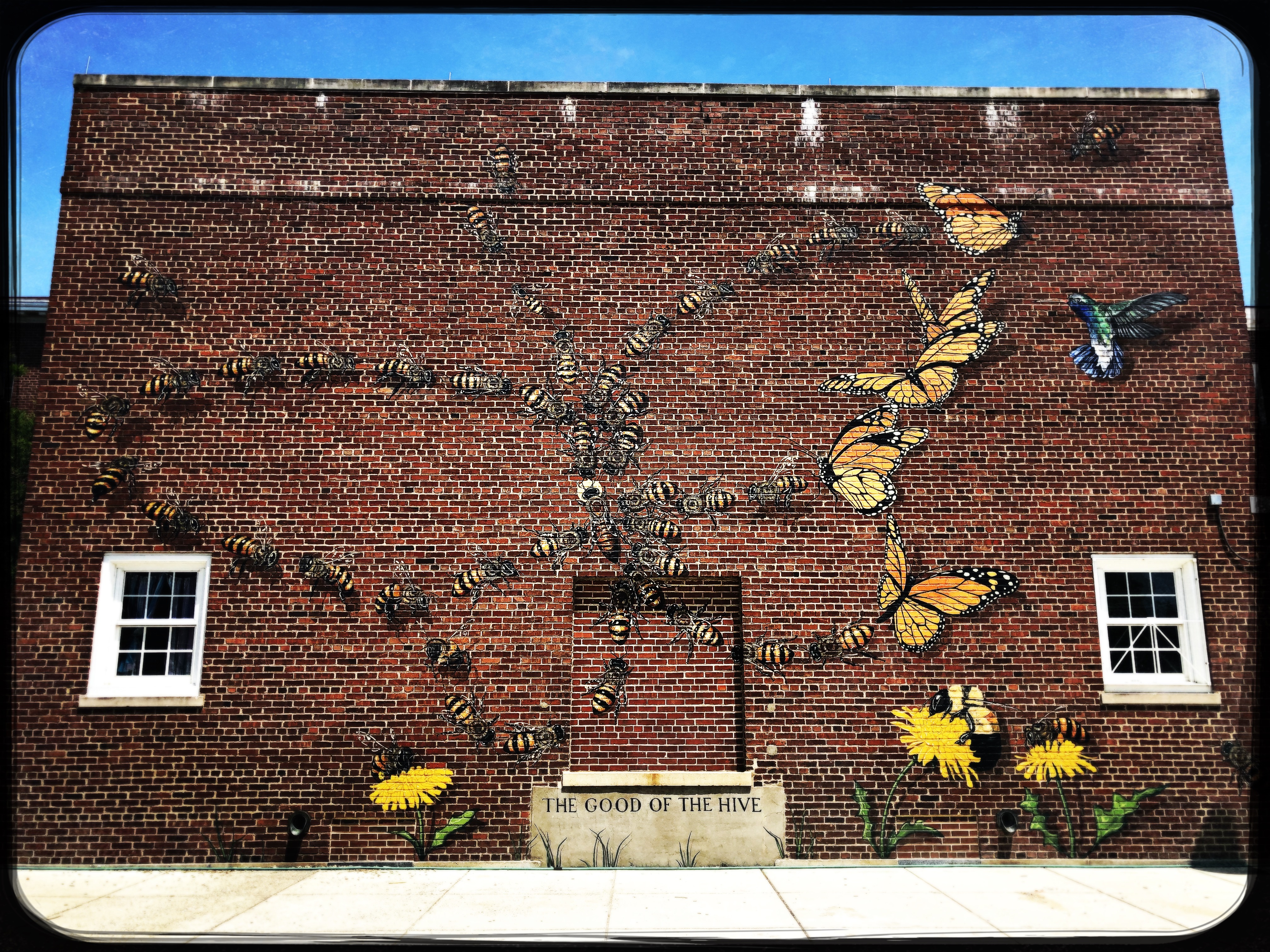 On the Janney school grounds, but not visible from the street, is this awesome mural by Matthew Willey. Willey has made a personal commitment to hand-paint 50,000 honeybees – the number necessary for a healthy, thriving hive – in murals around the world. You can read more about Willey and his project at http://www.thegoodofthehive.com