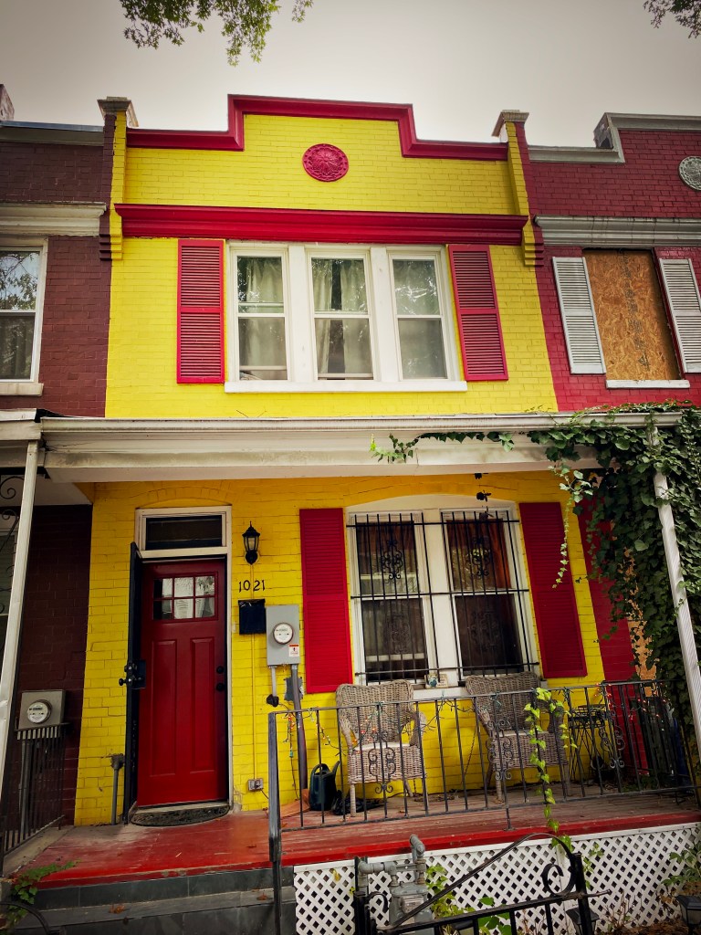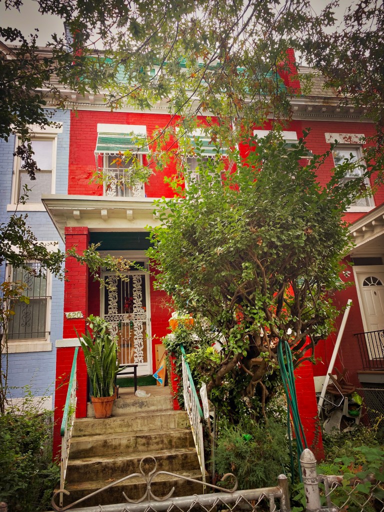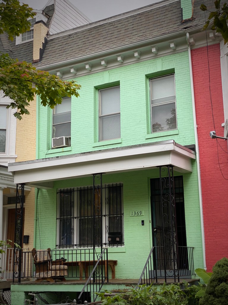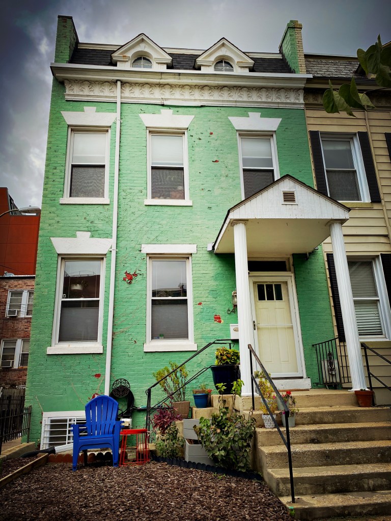On a grey day, we continued to explore Columbia Heights and neighboring Park View. The two areas are rapidly gentrifying. Consequently a large number of the small apartment buildings and row houses have been recently renovated. Many have been newly painted, often with bright colors. We decided to make green row houses (not eco friendly houses but those actually painted green) our theme of the day.
