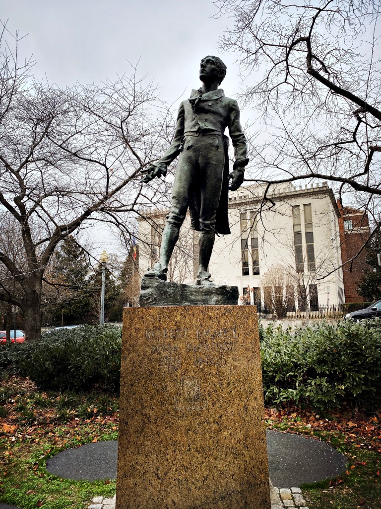 Along Massachusetts Avenue are statues of a number of famous revolutionaries (Nelson Mandela, Mahatma Gandhi, and Ataturk, among others). This one is of Robert Emmet (1778-1803), the Irish Republican, nationalist and rebel leader. After leading an abortive rebellion against British rule, Emmet was captured, tried and executed in 1803. The statue, by Jerome Connor, is said to serve as a tribute to how American democracy inspired the Irish independence movement.